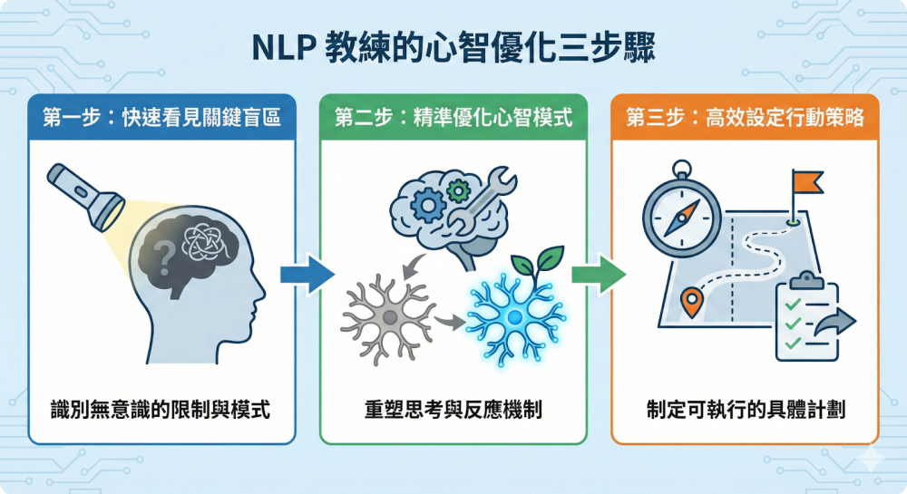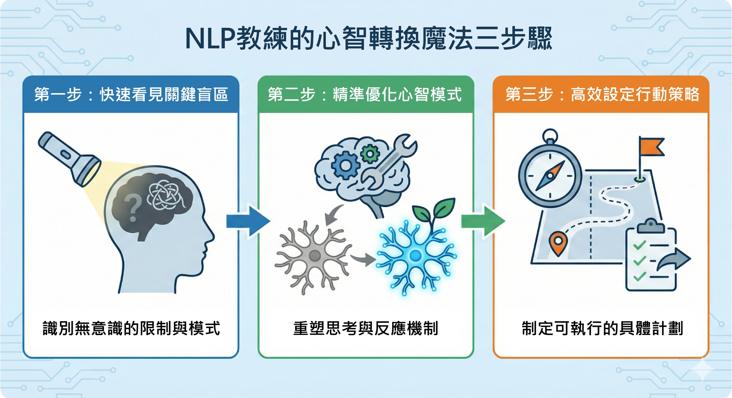 優化完軟體後,必須重新上路測試。NLP教練不談空泛的夢想,而是鎖定渴望的未來願景,制定具體且可落地的行動方案。這就像設定精準的導航系統,確保你的每一步執行,都穩健地朝向卓越推進。